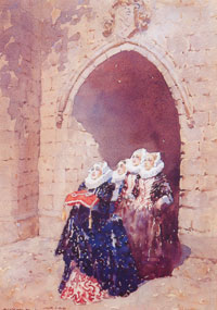 The watercolour of The Key show the women of Boom presenting the key of the village to the Spanish.